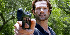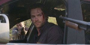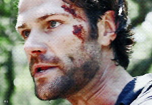 He sits there dazed and bleeding, looking very Sam Winchester, as two guys with guns come after him.