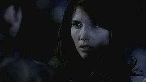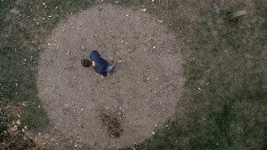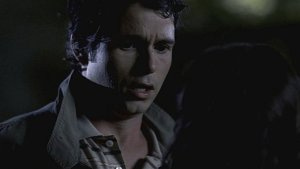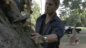 Dean walks through the graveyard, perhaps to distract himself from the grief that his brother is expressing and that Dean is trying to keep at bay. He notices a ring of dead grass around a tree and a fresh grave. Kim Manners gives us one of his signature crane shots as Dean looks around, spooky music playing. There’s a temporary grave marker there for Angela Mason and we realize that everything is dead around it in a perfect circle.