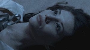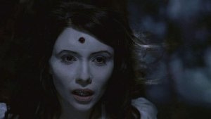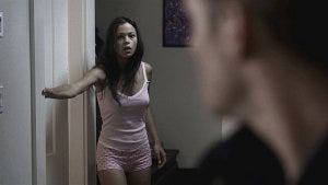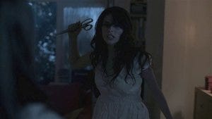 Sure enough, Angela attacks her roommate and they fight, the roommate eventually stabbing Angela with scissors. She falls to the floor and the roommate panics, leaning over her exclaiming “ohgod ohgod”. But in true horror movie fashion, Angela’s eyes snap open and she grabs the roommate and strangles her, pulling the scissors out of her own chest to stab her.