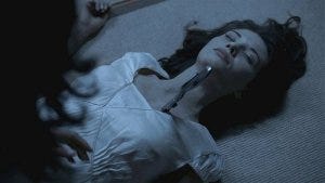 Anyway, Matt has a lot of houseplants, which makes me like him a little more, but they all start to suddenly wither and die. To his shock, Matt sees Angela’s reflection on the TV screen, then screams, as blood splatters all over the screen.