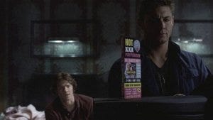 Back at the motel, Sam is watching Casa Erotica 4 (a tale of two Latin beauties because Sam is probably not as vanilla as Dean likes to tease him about being) on the motel TV, making good use of his alone time (though oddly he’s just sitting on the edge of the bed watching, which is not how this goes in fanfic).