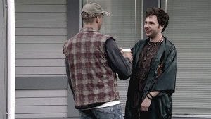 Andy appears, sauntering down the street wearing a bathrobe, as a beautiful woman waves goodbye to him. Our first introduction to Andy makes him memorable – partly the way Edlund wrote him and the priceless costuming, and partly because Gabriel Tigerman is a great actor who makes us feel for Andy from that first moment. Even when we’re not so sure he’s not a manipulative asshole! He runs into a man carrying a cup of coffee and the guy hands the coffee over, then he shakes hands with the Doc who we saw in Sam’s vision.