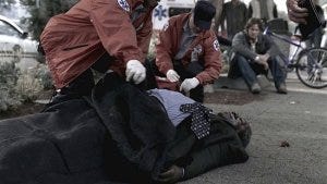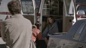 A medic checks out Sam’s shoulder, Dean hovering protectively. Tracy watches from another ambulance, but avoids looking at Andy.