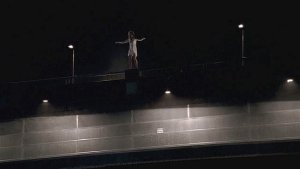 Suddenly Sam yells in pain, having another vision. Tracy (wearing lingerie because – damn it, there is no reason!) climbs up on a ledge and looks distressed, then jumps.