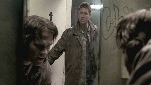 Sam splashes his face after the vision. Dean walks in on him impatiently, something that doubtless happens all the time.
