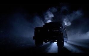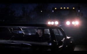 The open is the scary truck chasing after a car in the dark somewhere in Cape Girardieu, the radio gone staticky. The driver, a black man, skids to a stop and suddenly the truck is right in front of him, ramming into the car, windows shattering, until it drives him right off the road in a fiery crash. The truck pauses for a minute, ‘breathing’ hard through its exhaust pipe, and then drives off.