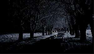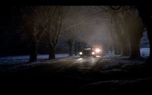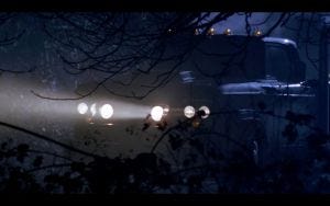The truck comes for Cassie that night, and this scene really is scary, the truck outside her house in the dark and the mist, its headlights pointed at the house as she frantically tries to shut curtains and shutters. It barrels right up to her house to the front door, its lights beaming through the glass in her front doors.