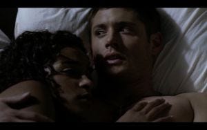 We don’t get a lot of sex scenes on Supernatural, so this one is notable – it’s a full on music montage, and Cassie is very much the one in charge and that’s … very interesting. (And yes fandom has spent a significant amount of time comparing and contrasting the Winchesters’ different styles of lovemaking because of course fandom has.)