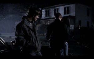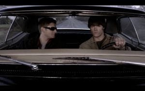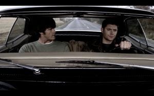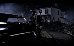 Sam and Dean go outside to make a plan, and have a conversation leaning against the Impala about how weird their lives are, Sam lamenting that his life was so simple before, just exams, papers on polycentric cultural norms…