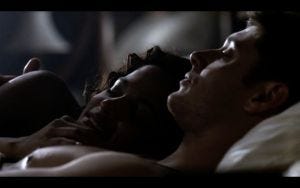 She strips off his jacket, throws him down on the bed and gets on top, kissing down his chest while he’s open mouthed and breathless. The lyrics of the song playing in the background are “sometimes I get a feeling I just can’t control…” and the cinematography (and Dean’s back) are lovely.