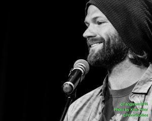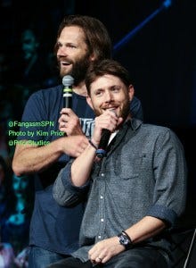 Then it was time for Jared and Jensen’s main panel! Jared took off his beanie and his over shirt and Jensen switched from coffee to water, so yes, it was afternoon.