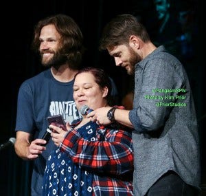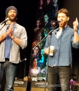 At some point in here everything went off the rails when a fan said something about killing Ruby 2.0 and Jared jumped up to go after her, and Jensen jumped up to intercept him, and then they just cavorted all over the stage again and again, Jared mock trying to get to the fan and Jensen physically holding him back while also doing the airline pilot imitation of “Abort, abort…”