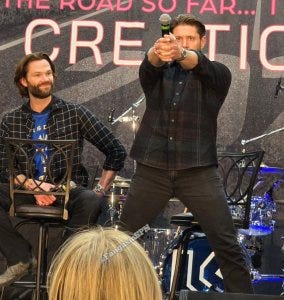 Jared: If they found out that Sam’s son was at the bunker, they’d be like, where’s Delilah? I was so proud of that. (Jensen and audience groan). I love your question for a special reason. We have a friend who we haven’t seen in a little bit, who designed the bunker and who came down from Jupiter, Florida, with his much better half, Nan. Our friend is named Jerry Wanek, and he is responsible for every single set you ever saw on Supernatural.