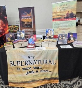 Here’s my table, with thanks to the friends from TheSPNVerse who helped me get it set up (and the talented Cris Griffin for the new table banner)!