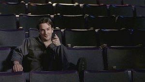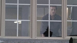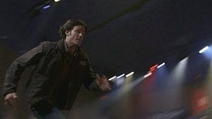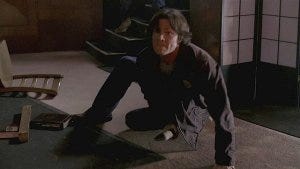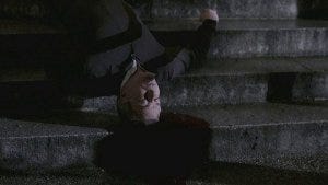 Outside the building, a janitor played by Richard Speight, Jr. watches as the professor’s body falls from the window high above, head splattered on the stones in a pool of blood.