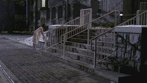 This episode opens with a professor walking to his office building at night, encountering an attractive young woman hanging out waiting for him, inexplicably dressed in a little sundress even though it’s cold and other people have jackets on.
