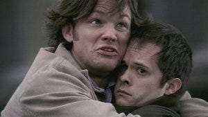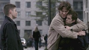 Sam wraps the guy up in a hug as Dean gives him an apologetic look.