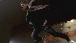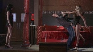 A rather epic fight ensues, the Trickster conjuring guys with chainsaws while the lingerie-clad women beat up Dean, one dragging him up and the other tossing him back and forth while they laugh rather delightedly. Can’t actually say I totally blame them as Dean’s shirt rides up and shows off some belly – not the beating him up part, but the having Dean Winchester between them? Not so bad.