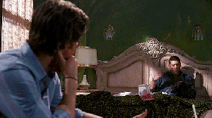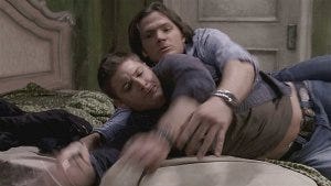 Sam tries to grab it, Dean pulls away, and Sam tackles Dean, the two falling onto the bed and getting into an epic wrestling match which is one of the most popular gifs in the Supernatural fandom. Jared and Jensen killed it, going all out and their faces alone making me laugh every single time I see it.