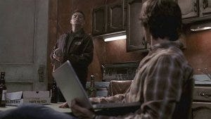 Back in the present, Bobby asks the obvious question – did Dean take Sam’s computer? Dean insists he didn’t, though it would serve him right.