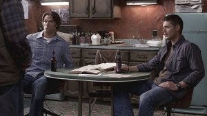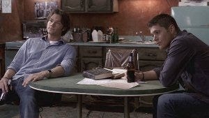 Back at the motel, despite their bickering, Dean still pops open a beer for Sam and puts it down in front of him. Sam opens his laptop to research and accuses Dean of being on his computer, since it’s frozen on BustyAsianBeauties.com. Dean considers, looks a little guilty, then walks out of the room.