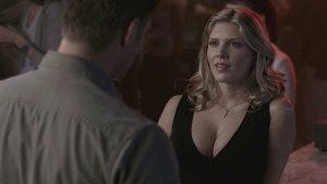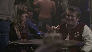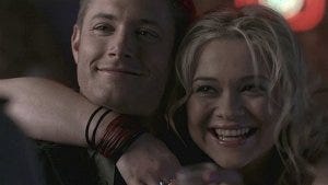 Sam tries to protest as Dean introduces Sam to Starla, drunk and smiling as she tries not to lose her drinks, giggling and wearing a short skirt and fishnet stockings and lots of makeup.