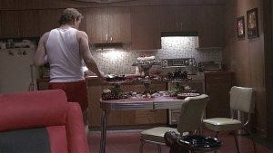 Cut to the janitor lounging in his apartment, cheesy music playing, reading the National Enquirer where all his deadly pranks could be pulled from the headlines, and hugging his cute little dog. He’s got on red boxers and a white tee shirt, surrounded by a table full of treats and sweets and a glass of champagne. He conjures two beautiful women in lingerie to feed him the food.