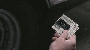 He holds up the money clip, and Sam realizes it’s not in his pocket and demands that Dean give him back his money. Dean refuses, saying it’s for reparations, for his emotional trauma.