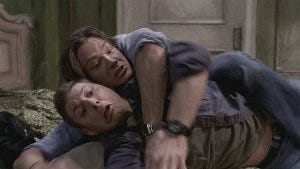 They kiss as Sam walks up, with what would become the famous Sam Winchester bitch face in evidence. (Also fun fact, in the early days of SPN fandom, we all used the phrase ‘it’s like staring into the sun’ to describe Jensen and Jared. For obvious reasons.)