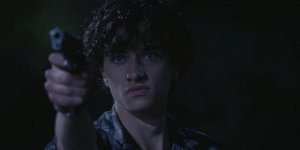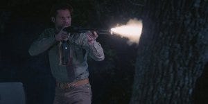 Clint goes for it and it looks for a moment like he’s going to win after all, raising it to shoot, when a shot rings out. Against all odds, it’s Liam who saves the day, barechested branded and bleeding, staggering out of the house.