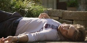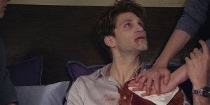 He sees Liam lying on the ground and goes to him. Liam coughs and wakes, saying “I’m bleeding”. Which, yes, substantially.