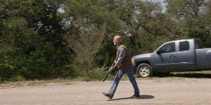 Bonham drives up and sees someone with a gun on the property, saying “well that’s never a good sign” and pulling a rifle from his truck instead of calling the police like any reasonable person would do! Is this some kind of Texas machismo thing? (Back to expected stereotypes again, I suppose).