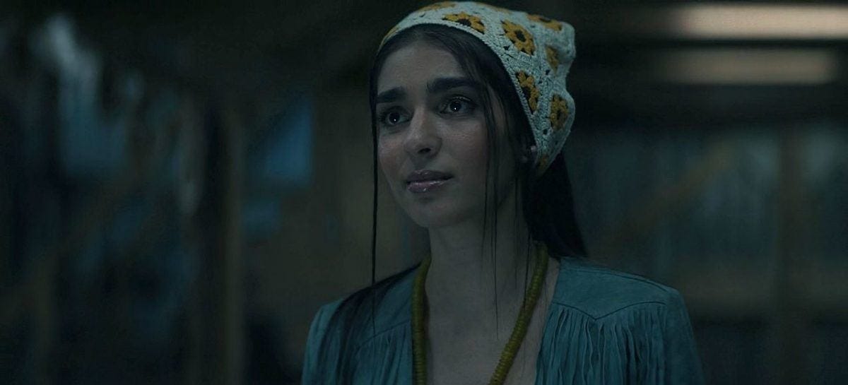 Okay, back to the episode – which had a great opener. A woman runs through the woods, falling, frightened, limping in the dark forest. She takes refuge in an old barn, starting to draw some protection sigils on the door, but the lights begin to flicker and then – in true horror movie fashion – she thinks the sound she heard was just a bird and shrugs, relieved.