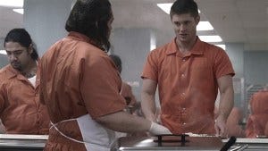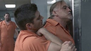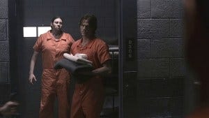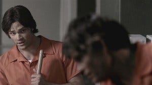 Dean tries to bond with cell neighbor Lucas in Solitary, and gets a “I wish I had a bat so I could bash your fricken’ head in” in return.