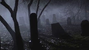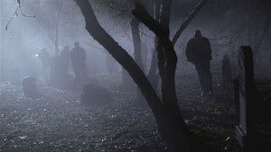 The FBI agents comb the cemetery, flashlights illuminating only gravestones.