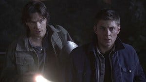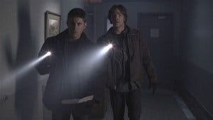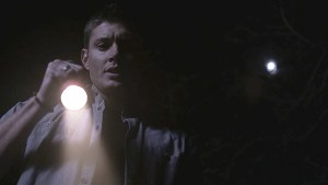 Cut to Sam and Dean in a dark graveyard, flashlights searching out the nurse’s grave.