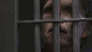 The guard tells him to cool it and go to sleep, but he keeps calling, the guard ignoring Randall’s insistence that he saw something. The lights go out and the guard goes to walk away when suddenly something slams the door on his arm and he’s attacked by something invisible, Randall watching from his cell as the guard screams.