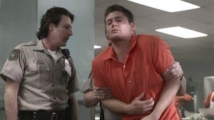 Cut to the detention center, Sam and Dean shuffling off the transport bus, chains around their wrists and ankles. Sam keeps looking at them, like, sheesh, how did I get myself into this?