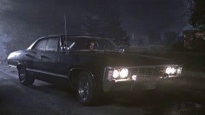 The Impala carries her boys away, glistening in the moonlight, rock music playing.