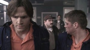 Sam and Dean confirm that they’ll be held at the Green River County Detention Center despite extradition papers filed from five states, because no judge in their right mind is going to grant them bail. Dean is suspiciously okay with this; Sam gives him a look.
