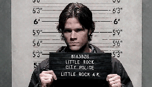 Sam is cranky doing mug shots too, and again, who wouldn’t be? Though he can’t help but look handsome anyway because that’s just Sam.