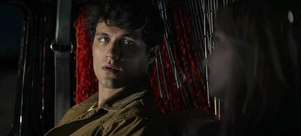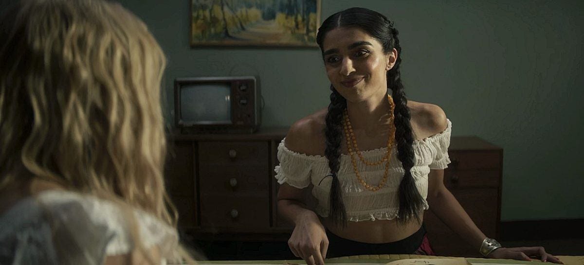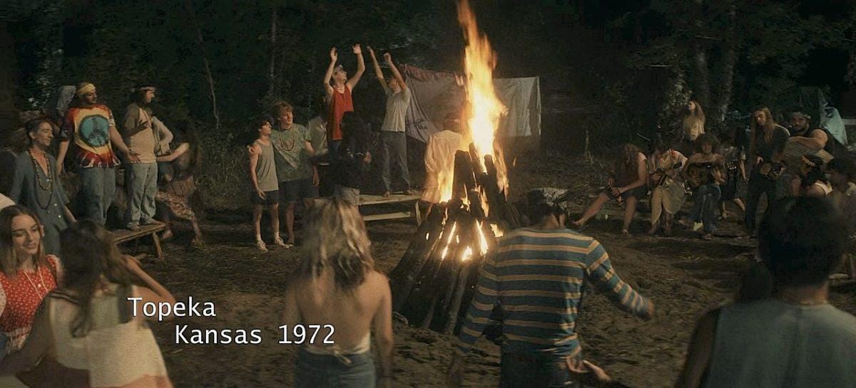 As someone who was alive then, I enjoy this show being set in that time period, though sometimes it strikes me as an idealized TV version of the 70s, which was complicated and not all peace-love-flower-power. This episode lets the show really sink into the flower power part of the time, the monster taking up residence outside a commune. It opens with kids (okay young adults maybe, this is a very young show) singing and swaying around a campfire, wearing flower crowns, doing drugs, walking in the woods… It’s a 2022 version of 70s nostalgia, and a little less gritty than I remember.