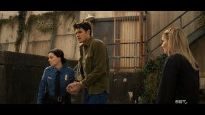 They confront Akrida cop as they try to toss John in the van, Millie throwing some punches of her own with “that’s for Kyle! That’s for my son!”