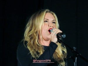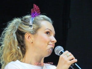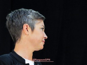 She stepped onstage and almost fell backwards, she was so overcome by everyone standing up and signing their enthusiastic clapping. It was a moment – an SPNFamily moment.