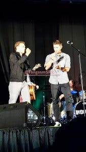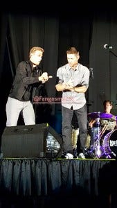 For some reason Jared ended up at first in a chair all the way in the corner of the stage, but Jensen was having none of it. He walked over and dragged the chair onto center stage next to his own.