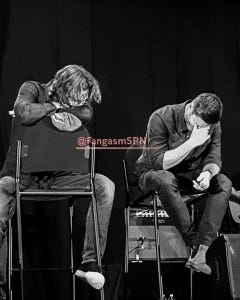 They also told the story of Ruth cupping Emily’s boobs in the middle of a scene, as a sort of prank on the crew. It backfired when they had no reaction at all. When they asked why, the crew replied that they had wanted to be respectful of their “acting choices”. Gotta love the SPN crew.