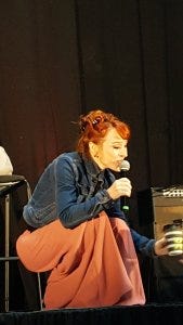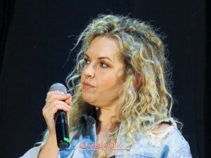Next up was another first time con guest, the wonderful and talented Shoshannah Stern. Jason Manns once again proved himself the consummate considerate host, organizing everyone to sign applause for Shoshanna.