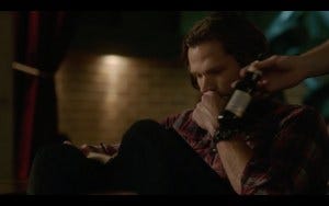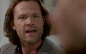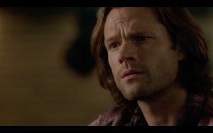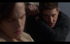 The doc cuts him off, but it’s fairly clear to the viewer that Sam was once again about to say something real. Maybe even ask his brother for what he needs from him. Dean can hear it too, and he full on panics, lashing out again.