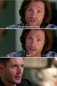 Dean’s utter inability to say no when Sam says “for me”, this is the show I fell in love with. You can see the effect that has on Dean. He can’t not say yes, not when Sam is asking that way. And Sam KNOWS it. That special bond that they have is right there on my tv screen and god damn that makes me happy.