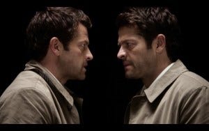 When this episode starts, however, Cas finds himself alone no longer. There’s an entity there with him that has his face and form, but it’s not exactly good company. In fact, it’s pissed as hell that when Cas woke up, he did too. The Empty is apparently the place where angels and demons go when they die, and they pretty much just slumber there, which means the Entity can slumber too. He loves sleep almost as much as I do, and that’s really saying something. That Castiel is now keeping him from his cherished sleep is making the Entity very cranky – which he takes out on Cas with a lot of physical abuse. Ouch.